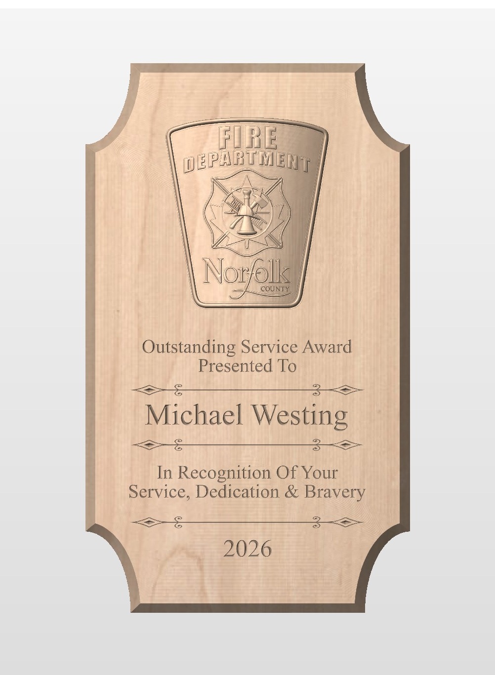 A 7″ x 12″ plaque for recognition made of cherry with a carved maple logo. These plaques are customized to the required specifications. The buyer is responsible for supplying any required graphics and additional information.
