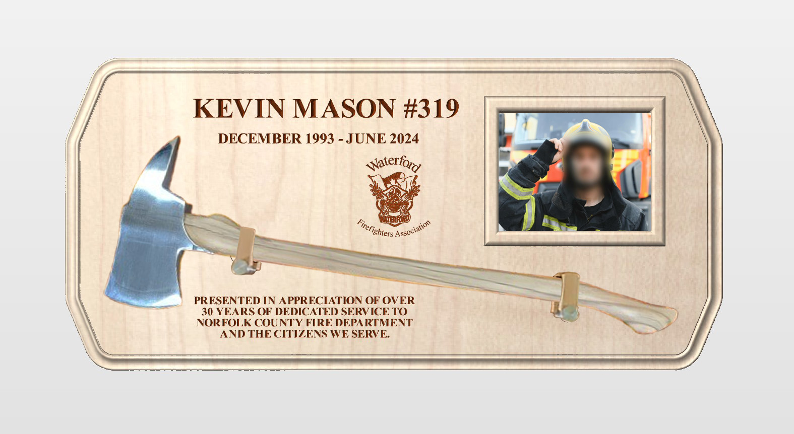 This is a large plaque that holds a full size axe, an 8″ x 10″ photo, the fire station logo, the firefighters name, badge number, dates and a dedication. The photo is held in place by a magnetic frame.
